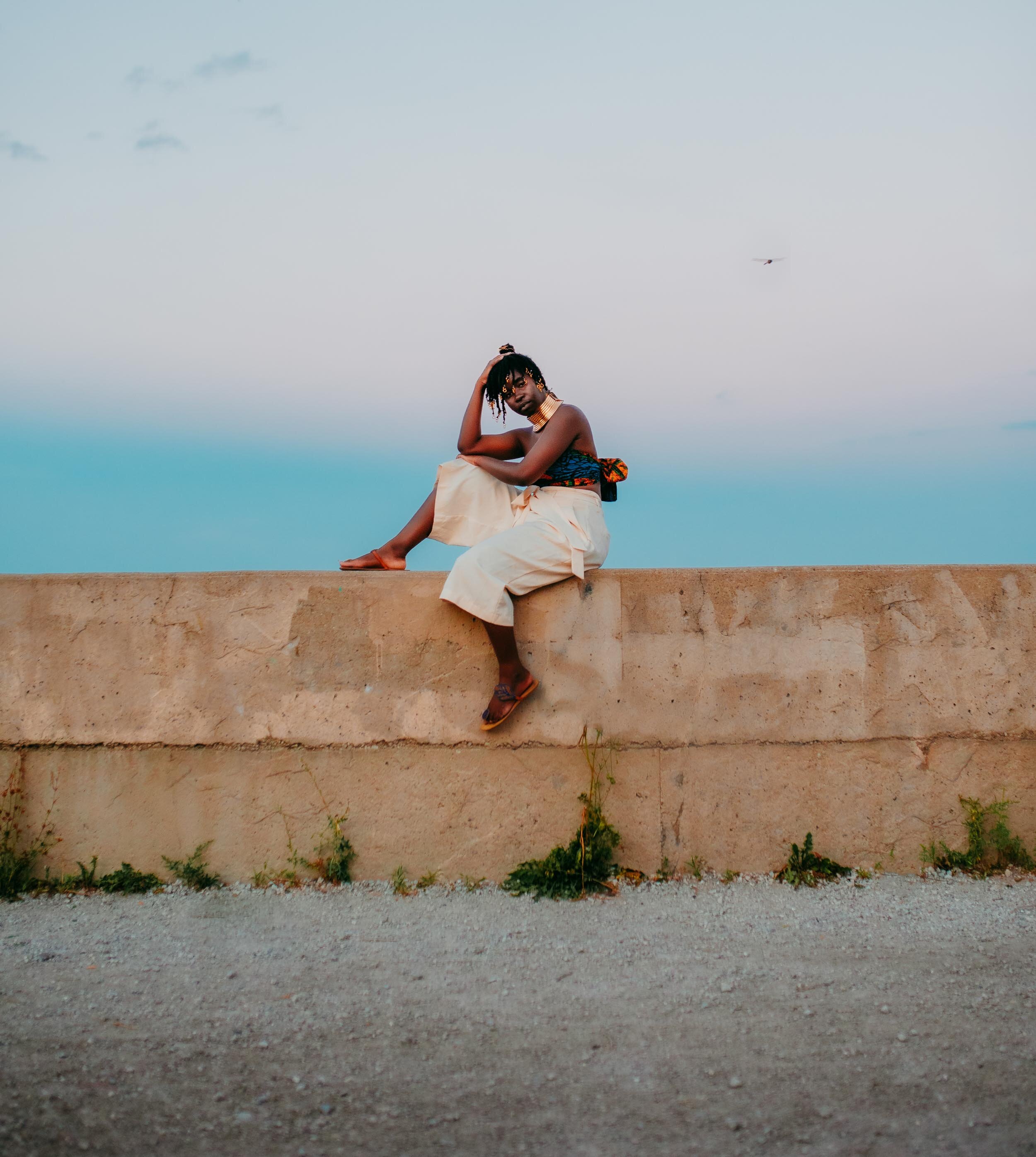 A person with dark skin and curly hair, wearing earrings and a patterned garment, is holding and touching their hair with both hands, posing against a backlit sky during sunset.